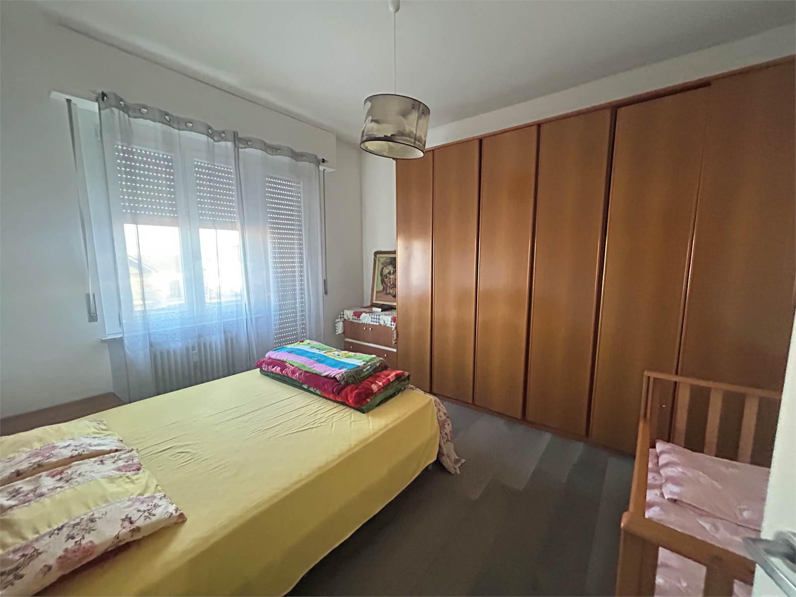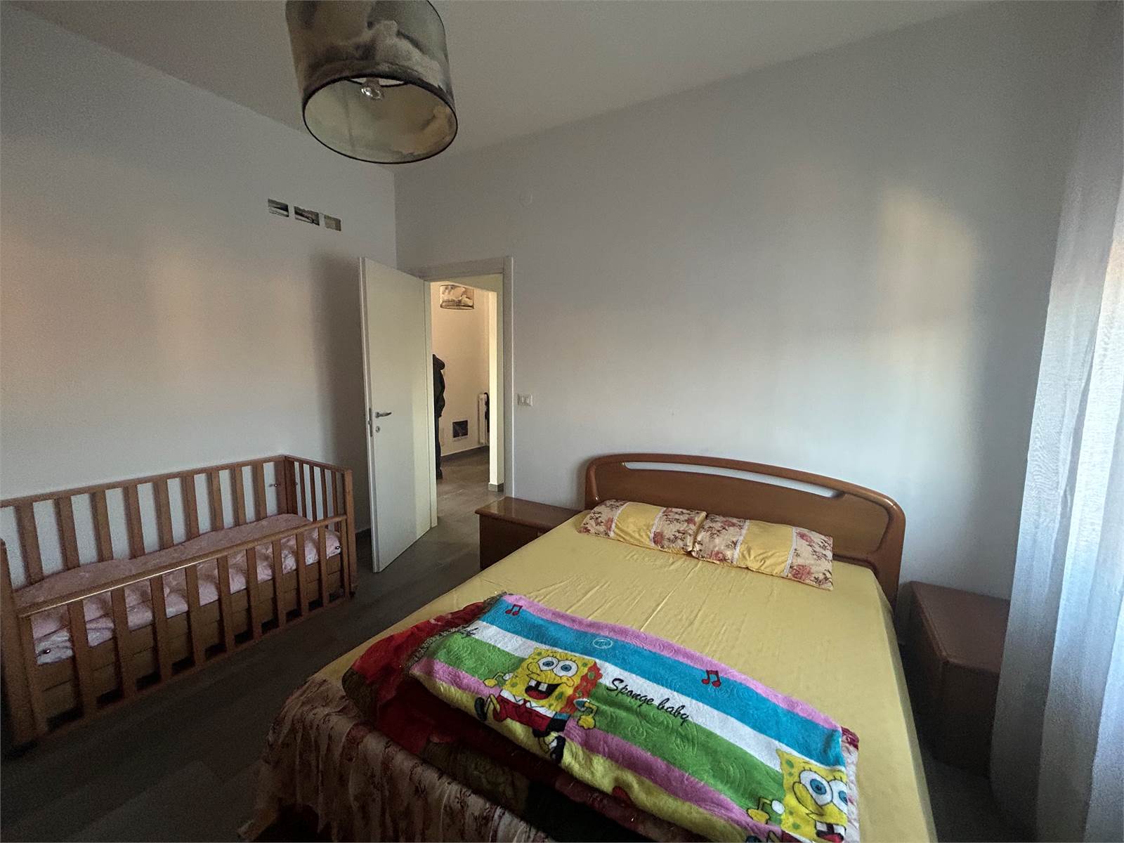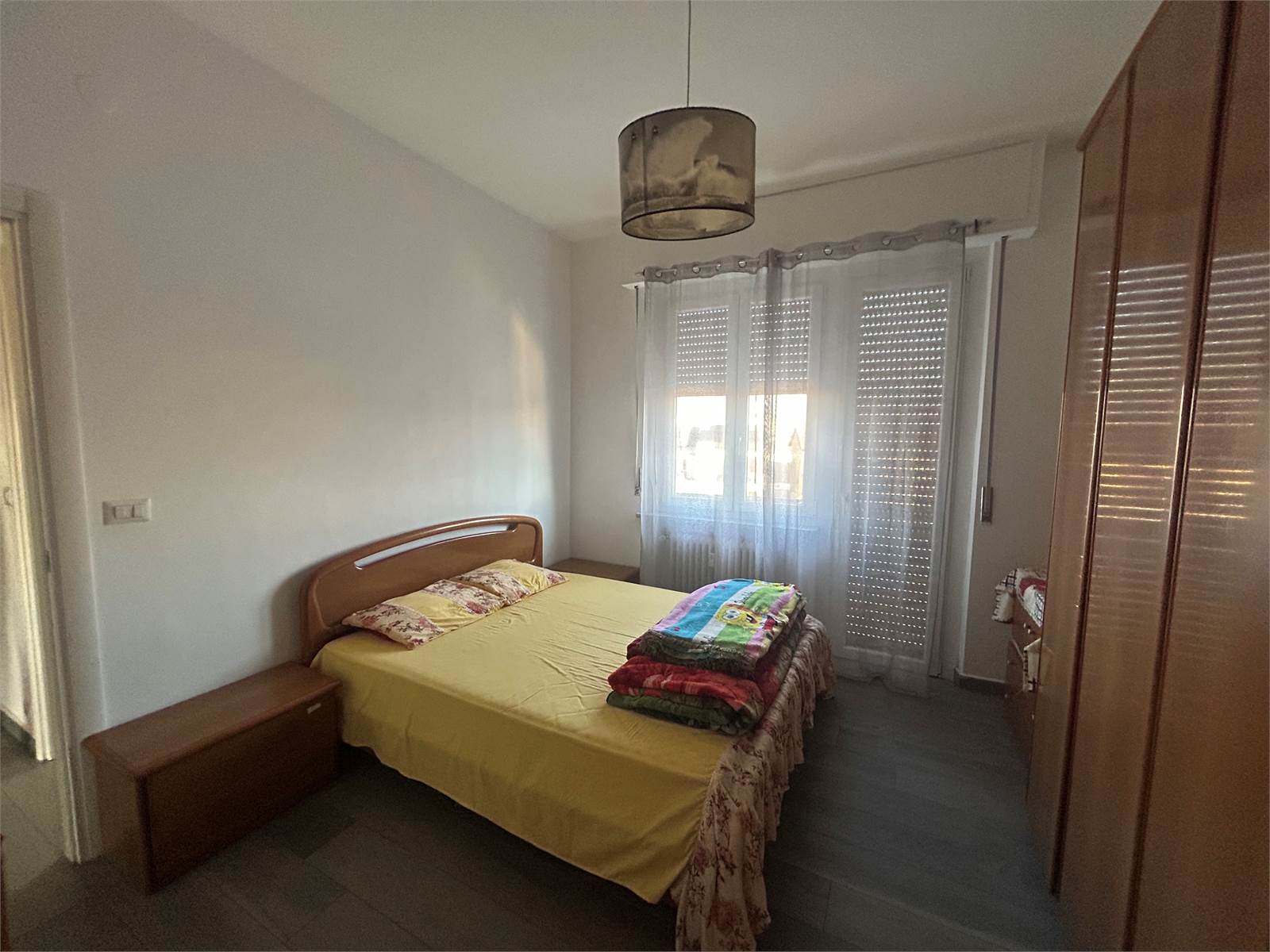 La zona notte comprende una spaziosa camera matrimoniale, una camera singola ben distribuita e due bagni finestrati, entrambi rinnovati con materiali di qualità.